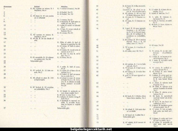“Hemmam’ın rivayetleri Buhari’nin Sahih’inde ve Müslim’in Sahih’inde bulunabilir ve her ikisi de bizzat Hemmam’ın Sahifesini kaynak olarak gösterirler; insanı etkileyen çok dikkat çekici bir olaydır ki, hem Hemmam ile diğerleri hem de Buhari ve Müslim arasında bir nokta farkı dahi yoktur. Aşağıdaki tabloda Hemmam’ın seri numarasını veriyor, Buhari ve Müslim’deki yerlerini gösteriyoruz. Burada K, kitap (bölüm), B, bab (kısım) ve numara da o kısım içindeki hadis numarasını verir…